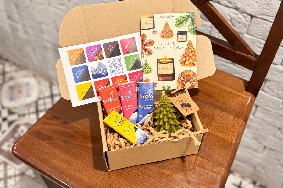 4 смаки шоколаду SoYKa без рафінованого цукру та свічка в формі ялинки з бджолиного воску – яскравий й атмосферний подарунок до свят. Здивуй рідних та близьких!