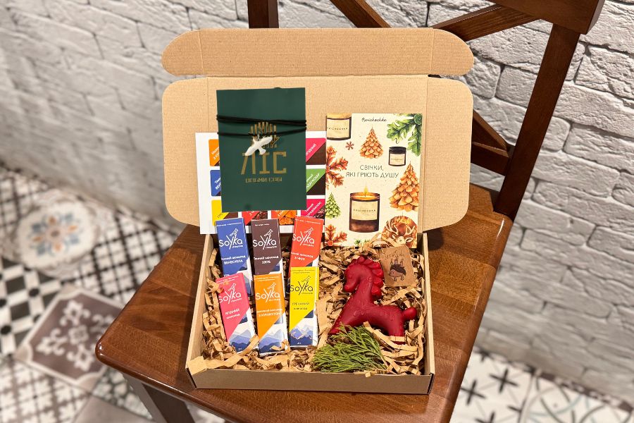 Ідеальний подарунок для дівчини або жінки: прикраса в формі білої пташки на шнурку від Арт.простору Ліс, 6 смаків різного шоколаду SoYKa, свічка-коник з бджолиного воску від майстерні Svichochka.